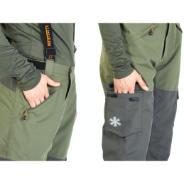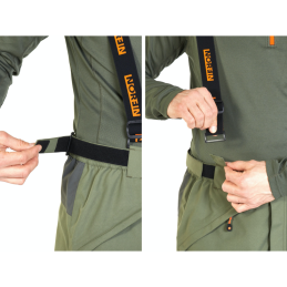 Housut: Irrotettavat ja säädettävät henkselit, vahvikkeet polvissa ja takana, säädettävät lahkeensuut