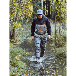 Kestävät ja hengittävät kahluuhousut integroiduilla neopreenisaappailla. Nelikerrosrakenne, säädettävät olkaimet ja vesitiivis tasku takaavat mukavuuden ja suojan kaikissa kalastusolosuhteissa.