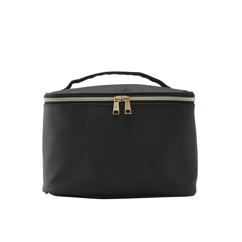 Musta isokokoinen kosmetiikkalaukku, jossa kahdensuuntainen vetoketju. Päällä kantokahva ja kannen sisäpuolella taskuja siveltimille. Keinonahkaa. Koko 27x18x17 cm