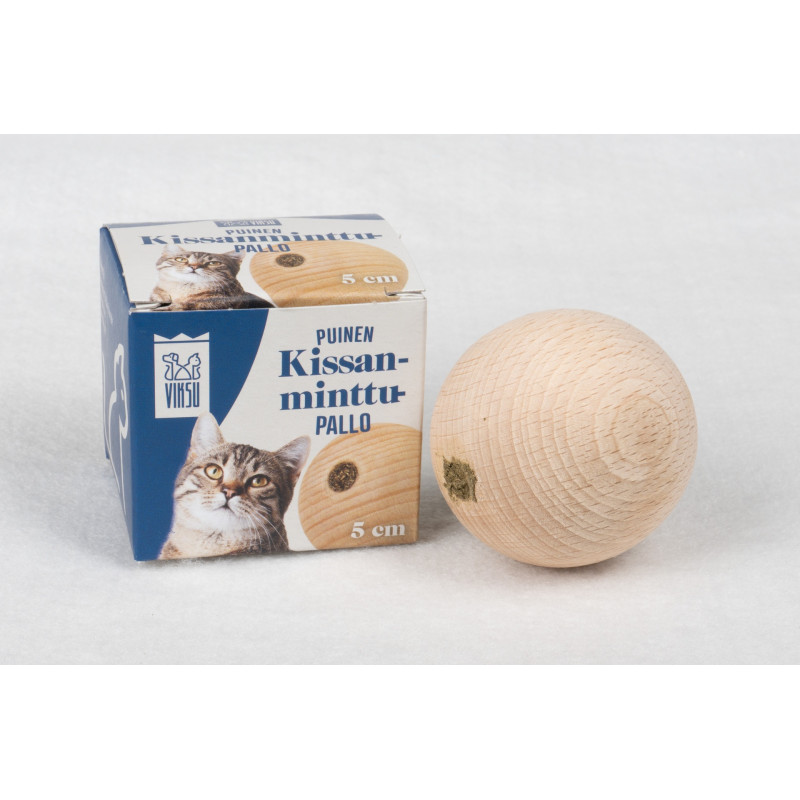 Uusi suosikkiharrastus kissallesi! 100 % Saksassa kasvatetusta kissanmintusta valmistettu puinen kissanminttupallo innostaa saalistusleikkeihin ja pyörittelyyn. Aromaattisen kissanmintun tuoksun ansiosta kissa rohkaistuu leikkimään ja lisäksi kissanminttu voi rauhoittaa jännittyneitä hermoja. Puinen kissanminttupallo jossa on kaksi kissanmintulla täytettyä reikää, sopii täydellisesti pyörittelyyn ja tällä tapaa edistää kissasi aktiivisuutta. Muistathan valvoa kissan leikkimistä ja poistaa käytöstä loppuun leikityt lelut!