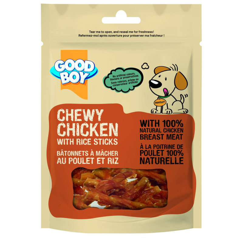 Dessa kyckling- och rispinnar är varje hunds favorit! Tillverkad av 100 % naturligt kycklingbröst insvept i en smakrik kycklingrisstav. Receptet av råhud gör dessa godsaker till ett bra komplement till en hunds balanserade kost. Utan konstgjorda färger, smaker eller konserveringsmedel, är dessa godsaker också lågfettiga och rostade i sin egen juice, vilket gör dem extra läckra. Dessa välsmakande tuggar är det perfekta sättet att behandla din hund på ett hälsosamt och välsmakande sätt.