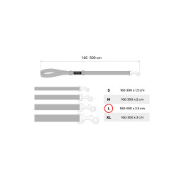 Hihnan säädettävä pituus sopii erityisesti pentujen kaunpunkikäyttöön. Kapein S-koon malli (leveys 1,5cm) soveltuu pienten rotujen koirille, alle 10kg ja M-koko (leveys 2cm) keskikokoisille 25kg, ja L-koko (leveys 2,5cm) isoille roduille 40kg asti.