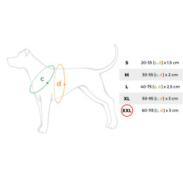 Valjaan rakenne varmistaa paineen jakautumisen tasaisesti, jolloin se ei ylikuormita koiran niskaa tai selkää, eikä aiheuta ylimääräistä puristusta ja painetta koirallesi olitpa sitten kävelyllä, lenkillä tai kovemmissa harjoituksissa. Vahva solki ja teräsrengas talutushihnan kiinnitykseen ovat erittäin kestäviä. Valjaiden eturengas ei ole säädettävissä. Sen tulee istua hyvin sekä lapoihin että rintalastaan. Kun valitset kokoa, varmista, että voit pukea sen koiran päälle pään kautta.