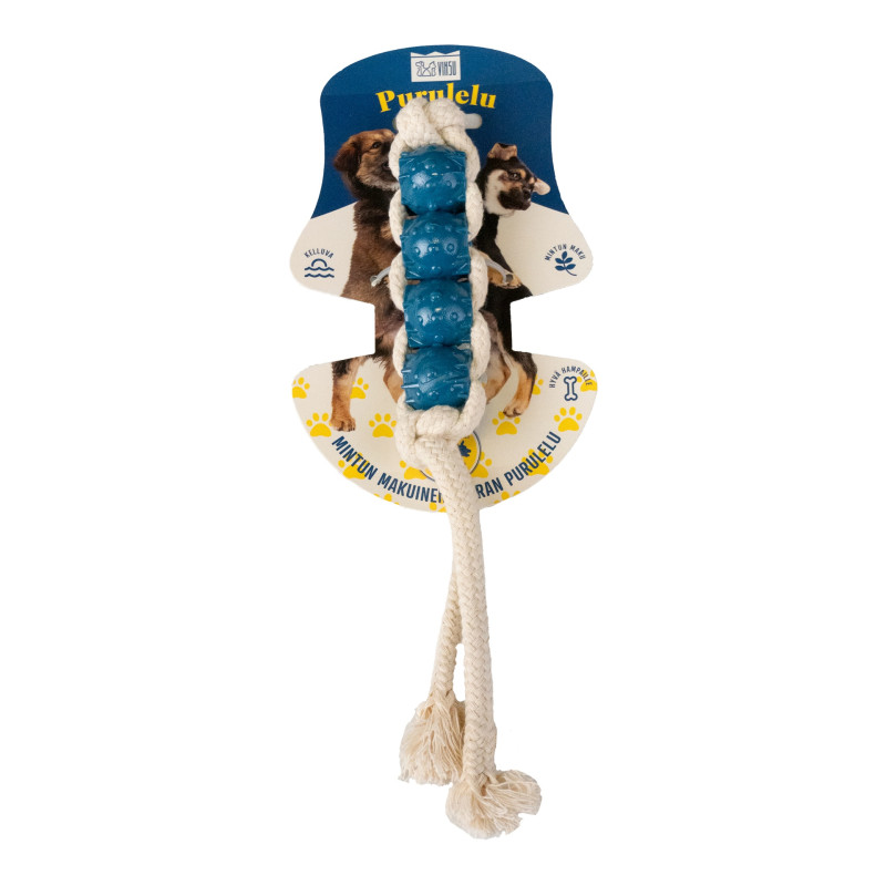 Ihana, pureskeltavan herkullinen Viksu-lelu on yhdistelmä kestävää puuvillanarua ja lemmikille turvallisesta TPE-muovista valmistettuja palloja. Näiden lelujen hauska muotoilu mahdollistaa leikin samalla, kun eri tekstuurein varusteltu lelu puhdistaa hampaiden pintoja. Piikkien ja solmujen ansiosta lelut voivat irrottaa hampaiden plakkia ja hieroa ikeniä. Ihana mintun tuoksu houkuttelee leikkimään.