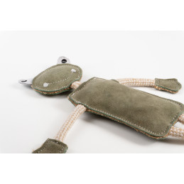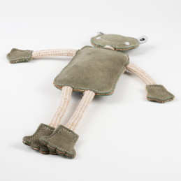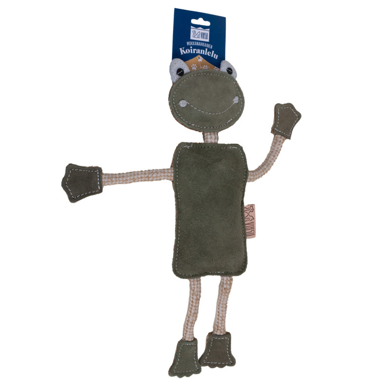 Veikeä, aidolla mokkanahalla päällystetty sammakkolelu, jossa on täytteenä kookoskuitua. Lujarakenteinen ja hauskanmuotoinen köysilelu heittoleikkeihin ja purtavaksi! Sammakon vartalo on valmistettu vahvasta juuttikankaasta ja päällystetty pehmeällä mokkanahalla.