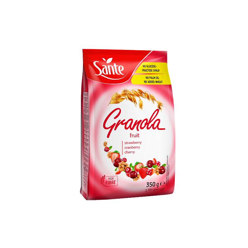 Fruktgranola är en exceptionellt krispig, kexliknande blandning av bakade fullkornshavregryn (45 % av innehållet), till vilken frystorkad frukt har lagts: hallon, jordgubbar, tranbär. Fruktgranola är en naturlig källa till tiamin och folsyra samt fyra mineraler: fosfor, magnesium, järn och zink. Fiberrik produkt!