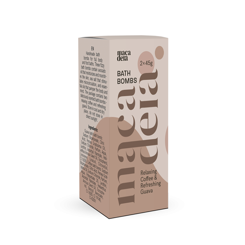Pakkauksessa on kaksi 45 g kylpyporetta: virkistävä guava ja rentouttava kahvi.