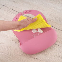 Tarttumaton pinnoite tekee puhdistamisesta erittäin helppoa. Toisin kuin kankaiset ruokalaput, jotka on aina puhdistettava suoraan pesukoneessa ja jotka silti usein haalistuvat pysyvästi, silikonilappu voidaan puhdistaa helposti tahroista juoksevan veden alla.