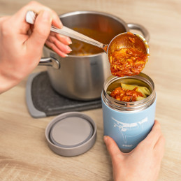 Kestävyys kohtaa käytännöllisyyden: Metallinen sisusta tekee tästä termoksesta erittäin kestävän, joten se kestää päivittäistä käyttöä ja säilyttää eväät lämpiminä useita tunteja. Tiiviin kannen ansiosta voit olla varma, että sisältö pysyy turvallisesti sisällä, ilman pelkoa vuodoista tai sotkusta.