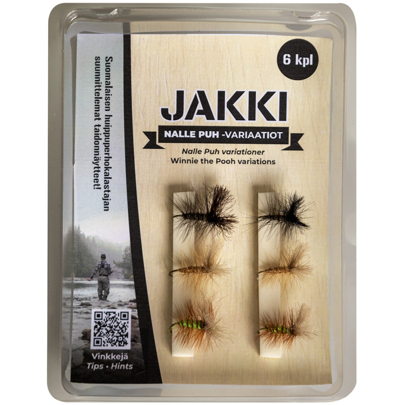 Perhokalastuksen joukkue-Suomenmestaruuden voittaneen perhogurun Suomeen suunnittelemat huippuperhot valmiissa lajitelmissa. Nalle Puh on Suomen kansallisperho. Voit käyttää sitä virtavesissä tai järvillä. Kaikki kalat pitävät siitä! Uitetaan vapaasti tai viistättämällä. Tumma versio hämäriin hetkiin ja vaaleammat päiväkalastukseen. Suositeltava perukkeen paksuus 0,16-0,22mm