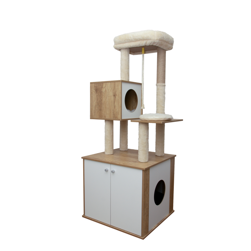 Viksu kissan raapimapuu kaapilla on oikea tilaihme! Kissanpuu yhdistää kauniin ulkomuodon sekä kekseliään ja käytännöllisen designin. Ylin peti houkuttelee suuremmatkin kotitiikerit löhöilemään ja seuraamaan valtakuntansa tapahtumia turvallisesti korkeuksista, kun taas mökissä saa makeat unet muiden vilinältä piilossa. Nämä kaksi petiä varmistavat, että kissallesi on aina tarjolla juuri sopiva paikka!