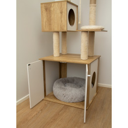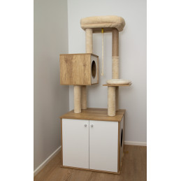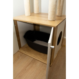 Kauniit puukuvioidut pinnat jo erottavat tämän raapimapuun markkinoiden muista malleista, mutta kissanpuun todellinen valtti on sen alaosan kaappi. Oikeassa reunassa on kissaa varten kulkuaukko, ja tilavaan sisäosaan saa esimerkiksi hiekkalaatikon tai suuren pedin. Säilytystilaa kaipaava omistaja voi kuitenkin halutessaan sulkea kulkuaukon omin konstein ja käyttää kaappia johonkin ihan muuhun. Vetonupit ovat ihmiskäsille helppokäyttöisiä, mutta tassuilla niitä on vaikea avata. Magneetit pitävät kaapinovet visusti kiinni.