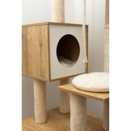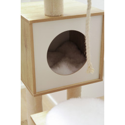 178 cm korkea, lujatekoinen ja laadukas kissanpuu kolmella pedillä ja yhdellä pesäluolalla. Väreinä sisal-köydellä käärityissä tolpissa on klassinen beige, kun taas pehmeät kankaat ovat hennon lohenpunaisia. Pesän seinämät ovat tyylikkään harmaat ja puukuvioidut tasot kiinnittävät katseen! Kokonaisuus on kaunis ihmisen silmään ja kissan näkökulmasta...
