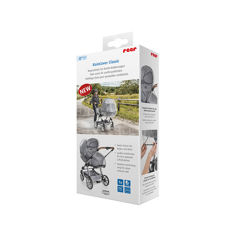Reer Classic yhdistelmärattaiden sadesuoja sopii sekä vaunukopalle että ratasistuimelle. Sadesuojan ikkunan ansiosta lapsen hoito on helppoa silloinkin, kun sadesuoja on paikoillaan. Ikkunen yläpuolella oleva pieni katos ehkäisee sateen ja tuulen pääsemistä suojan sisäpuolelle. Paikalleenasettaminen ja käystöstä poisto on helppoa, sillä suojaa kiertää kuminauha.