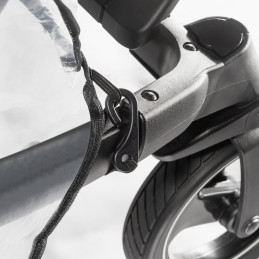 Yllättikö sade, lumi tai voimakas tuuli? Sadesuoja voidaan asentaa takana olevien tarranauhojen ja kiinnityskoukkujen avulla, tarjoten joustavaa ja turvallista suojaa. Näin pienet matkustajasi pysyvät kuivina ja suojassa.