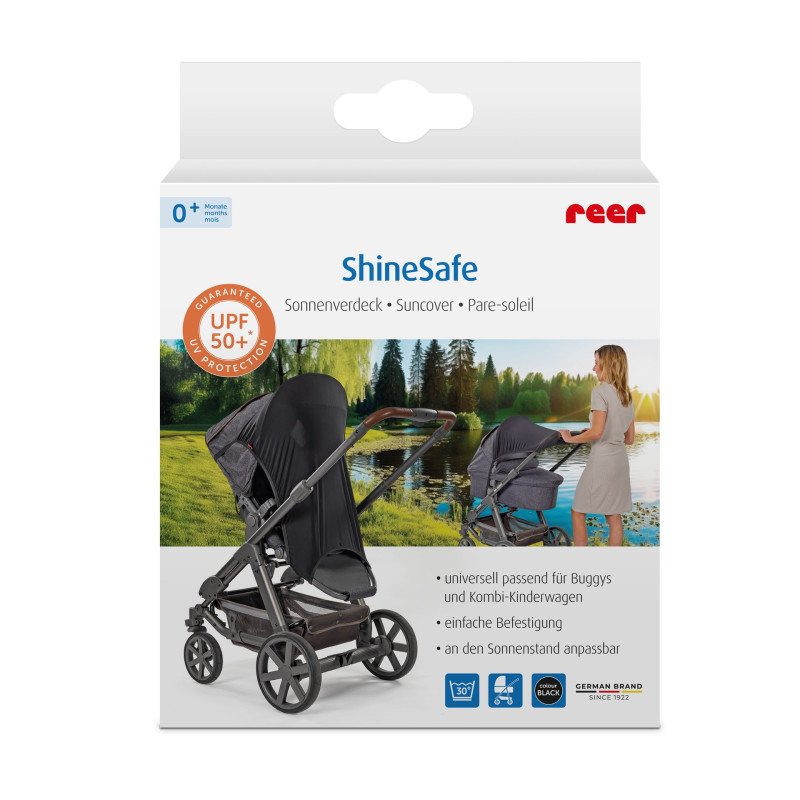 Reer aurinkosuoja rattaille ja turvakaukaloon suojaa lasta tehokkaasti auringon haitalliselta säteilyltä ulkoilun aikana. UPF 50+ -suojakerroin estää auringon säteet, ja materiaali suojaa samalla kevyeltä tihkusateelta ja sivutuulelta. Suojaa voi säätää auringon asennon mukaan, joten lapsi pysyy varjossa tilanteesta riippumatta. Sopii käytettäväksi sekä turvakaukaloiden että rattaiden kanssa. Asennus on nopeaa ja vaivatonta: aurinkosuoja asetetaan vaunukopan tai istuimen päälle, koukut kiinnitetään alaosaan ja toinen pää vedetään työntöaisan yli. Kevyt ja joustava materiaali (85 % polyesteriä, 15 % spandexia) tekee käytöstä sujuvaa kaikissa olosuhteissa.