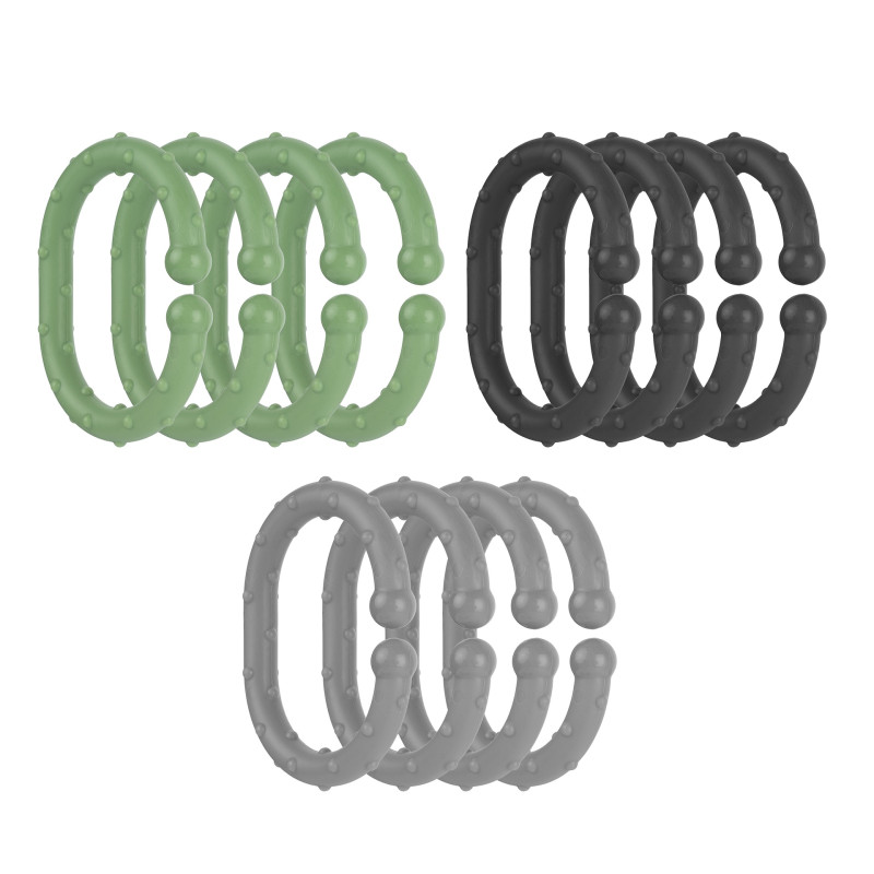 Reer Clip&Go kiinnityslenkit 12 kpl pitävät tutit, lelut ja peitot tallessa sekä kotona että liikkeellä. Lenkit on helppo kiinnittää vaunuihin, rattaisiin, turvakaukaloon, kantoreppuun, leikkikehään tai pinnasänkyyn – näin tärkeät tavarat eivät putoa lattialle tai katoa matkalla. Ketjuttamalla lenkeistä voi rakentaa myös hauskan motoriikkalelun, joka houkuttelee vauvaa tarttumaan ja harjoittelemaan hienomotoriikkaa.