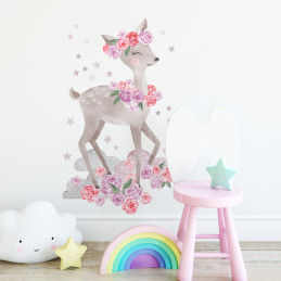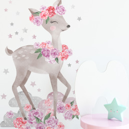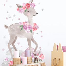Vaaleanpunainen Kauris-tarra on osa pionisarjaa, joka on luotu kaikille kukkakuvioiden ja metsän eläinten ystäville. Setti sisältää pionein koristellun kauriin kooltaan 53x91cm, pioneita, pilviä ja joukon irrallisia tähtiä. Pionisarja syntyi aivan omintakeisella tavalla: ensin tehtiin luonnokset koko sarjasta, sitten ne maalattiin akvarellimaaleilla erityispaperille, ja lopuksi ne viimeisteltiin tietotekniikan avulla tulostettavaan muotoon. Tämän prosessin kautta sarjasta tuli ainutlaatuisen kaikilta osin.