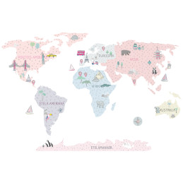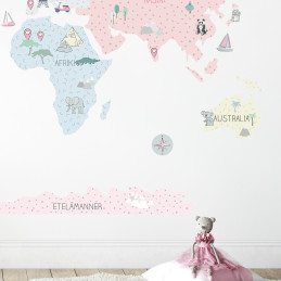 Korkealaatuiset maailmankartat on piirretty erittäin huolellisesti yksityiskohtia myöten. Värityksessä on käytetty hillittyjä skandinaavisia pastellisävyjä. Setti sisältää mantereet ja saaret suomenkielisillä nimillä sekä irrallisia lisätarroja, jotka voi sijoittaa haluamallaan tavalla.