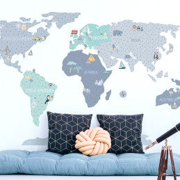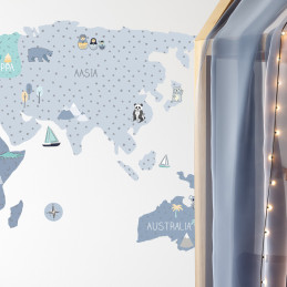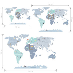 Korkealaatuiset maailmankartat on piirretty erittäin huolellisesti yksityiskohtia myöten. Värityksessä on käytetty hillittyjä skandinaavisia pastellisävyjä. Setti sisältää mantereet ja saaret suomenkielisillä nimillä sekä irrallisia lisätarroja, jotka voi sijoittaa haluamallaan tavalla.