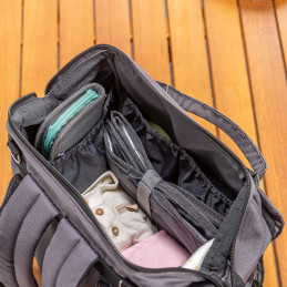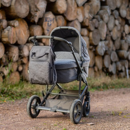 Ota helposti kaikki tarvittava mukaan ulkoilemaan lähtiessä! Tämän tyylikkään ja monikäyttöisen vauvanhoitorepun voit kiinnittää helposti rattaisiin ja vaunuihin Clip&Go-koukkujen ansiosta, mutta pehmustetut ja säädettävät olkaimet tekevät siitä myös mukavan kantaa selässä. Repussa on laajeneva ja järkevästi osioitu sisusta sekä lapsen, että aikuisen tavaroita varten, sekä useita lämpöä ja kylmyyttä eristäviä lisätaskuja. Eristetyssä sivutaskussa voit säilyttää esimerkiksi tuttipulloja, jos nälkä yllättää kesken lenkin! Toisella sivulla on kätevä tasku, joka on suunniteltu erityisesti kosteuspyyhkeille. Repussa on mukana vaipanvaihtoalusta — onhan mukavampi käyttää omaa ja varmasti hygieenistä — sekä Clip&Go-koukut. Likaahylkivän kierrätetyn materiaalin ansioista reppu ja vaipanvaihtoalusta ovat helppoja puhdistaa.